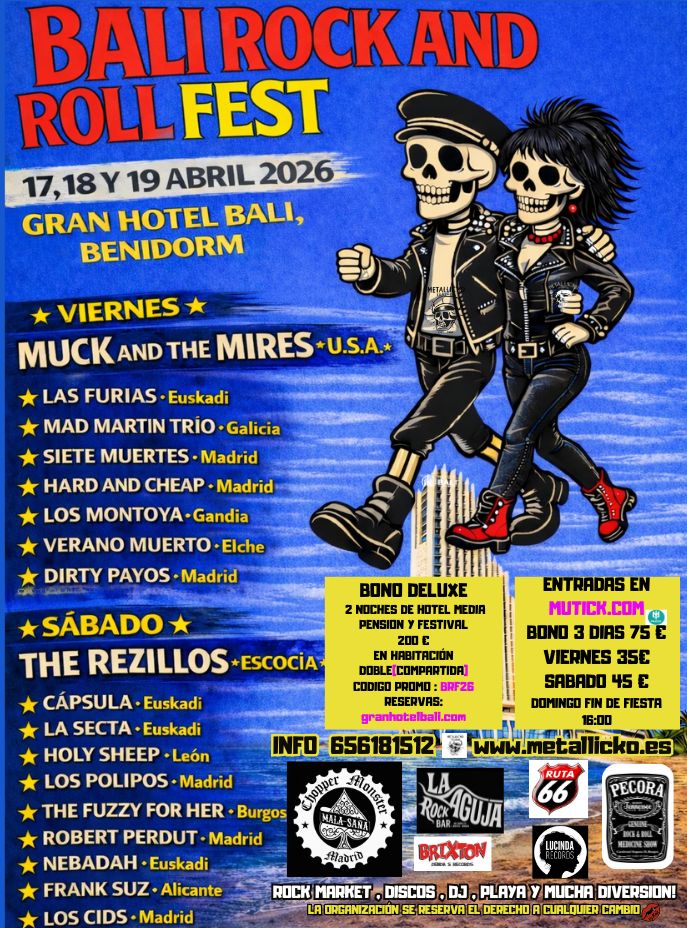 El viernes 17 ABRIL Estarán en Benidorm, en el BALI ROCKANDROLL FEST en el escenario principal a partir de media noche. Comparten cartel con bandas internacionales como Rezillos y Muck and the Mires y nacionales como The Dirty Rhythms en su versión Rumbabilly (Los Dirty Payos, viernes 1830h) , Mad Martin ,Los pólipos, etc