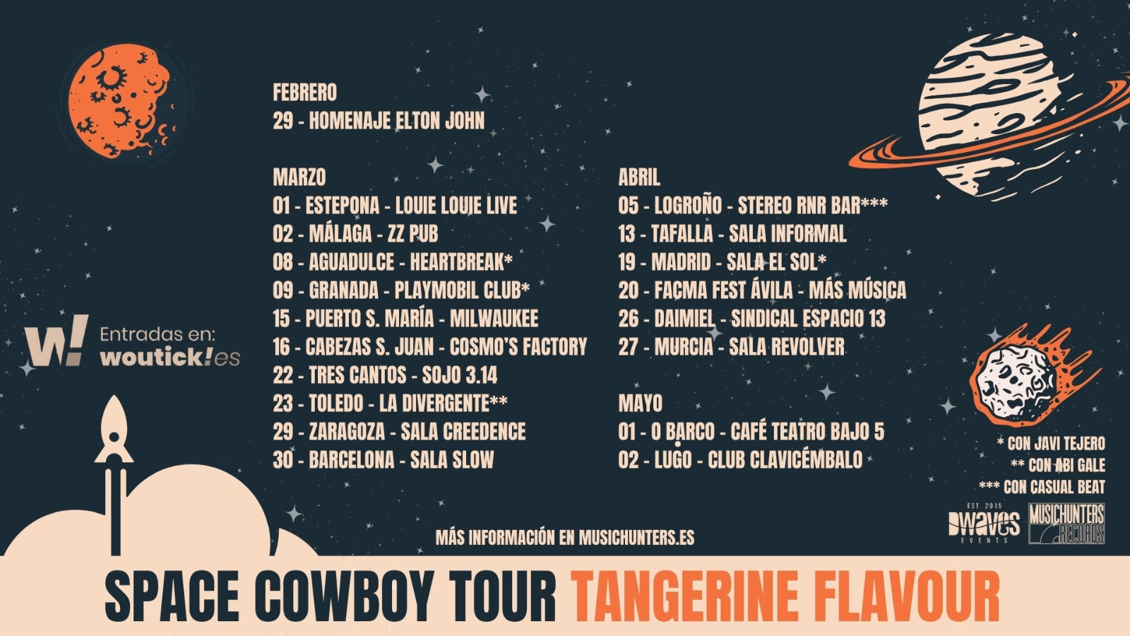 ¿Qué conocemos de Space Cowboy?, pues de momento han salido a la luz cuatro singles que han supuesto y golpe de autoridad por parte de Tangerine Flavour. En ellos se han salido de sus lugares de seguridad y han propuesto canciones con ritmos nuevos y atrevidos. El resultado, pues a la vista está, ¨Rainha do Sul¨, ¨Por la puerta de Atrás¨, ¨Outlaw City¨y ¨Five Tears of Dust¨, canciones con las que la banda ha conseguido un salto cualitativo de calidad, lo que ha supuesto un aumento en su masa social de oyentes. Todo esto hace que los nuevos directos sean aún más atractivos, y para que no os perdáis ni uno solo de sus conciertos, os dejamos aquí cada una de las fechas ya confirmadas.